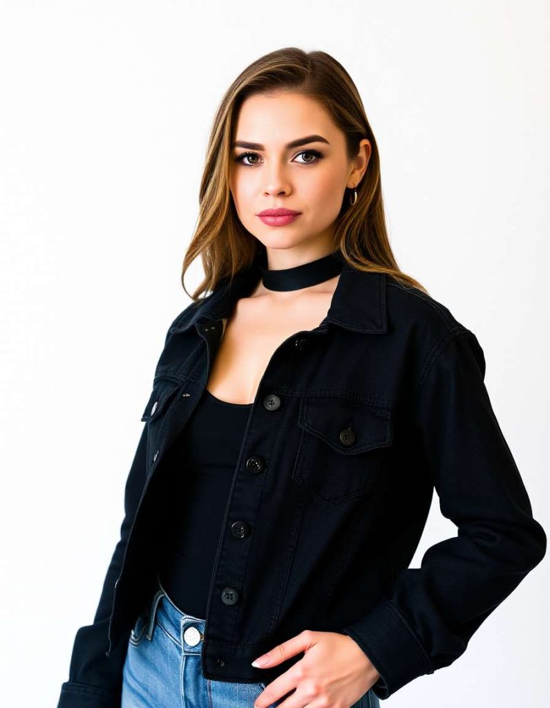 A black denim jacket coupled with a choker necklace creates a grunge look oozing with personality. The sleek jacket and accent accessory elevate this style, ideal for anyone wishing to inject a bit of rock ‘n’ roll into their everyday fashion. The subtle background complements the outfit’s assertive, rebellious energy.