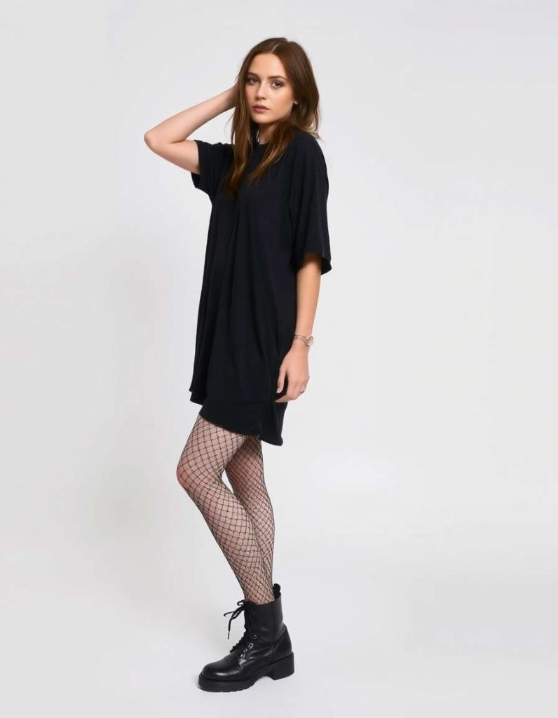 A relaxed t-shirt dress combined with fishnet tights and combat boots results in the ideal rebellious grunge ensemble. This pairing is perfect for achieving a comfortable yet striking appearance brimming with attitude. The neutral background highlights the audacious style of the outfit.