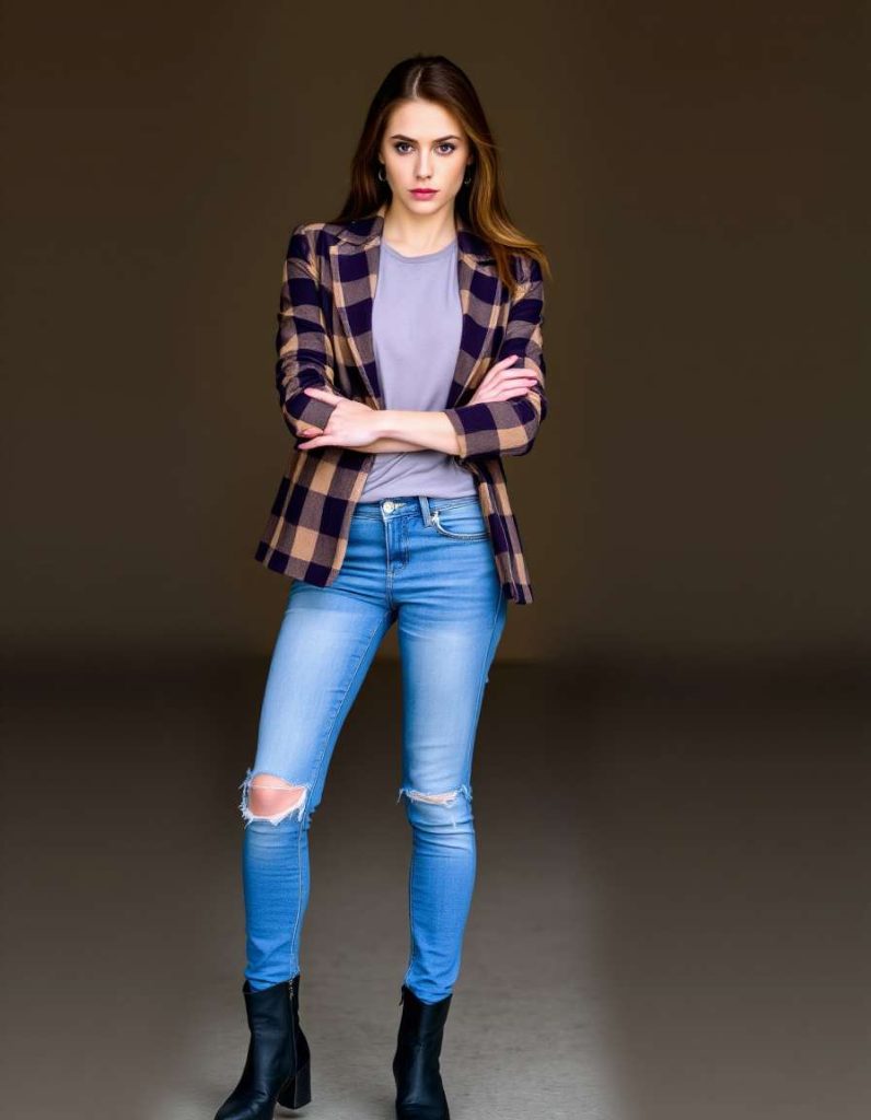 A checkered blazer paired with ripped jeans offers a seamless mix of grunge elegance and casual chic. This combination merges the rawness of grunge with the structure of a blazer for an unanticipated yet fashionable outfit. The gentle background ensures that the bold style remains in the limelight.