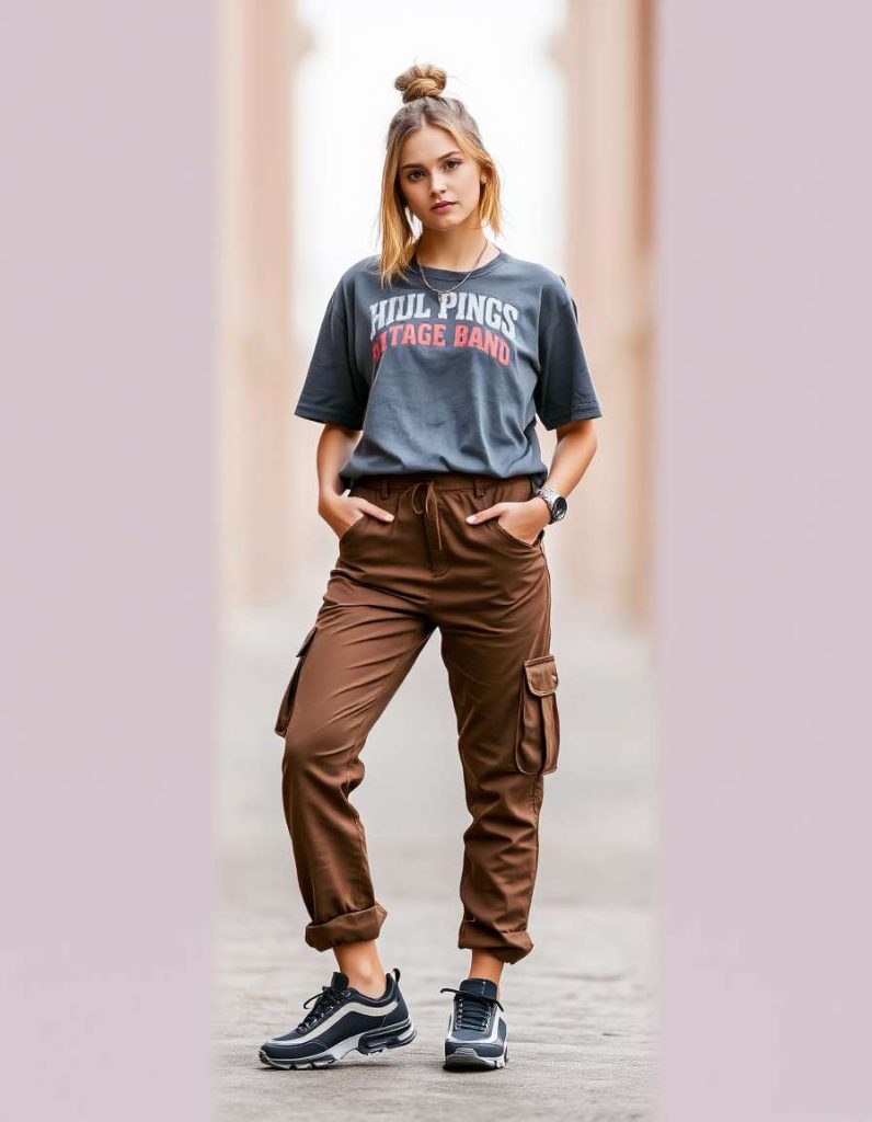 A retro band t-shirt tucked into high-waisted cargo trousers provides a grunge style with an urban touch. The inclusion of chunky sneakers rounds off this effortlessly chic and practical outfit. The soft background maintains focus on the ensemble’s rebellious allure.