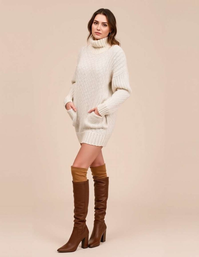 A snug oversized knit sweater teamed with knee-high boots creates the ideal grunge outfit for cold days. This look radiates comfort and style, infused with a rebellious spirit that epitomizes grunge. The soft, neutral backdrop ensures that the outfit takes center stage.