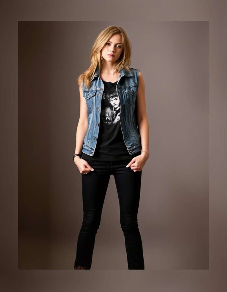 A denim gilet layered atop a classic band t-shirt forms a grunge outfit that’s both audacious and stylish. When teamed with skinny black jeans and boots, this look is perfect for those aiming to flaunt their rock ‘n’ roll essence. The soft backdrop enhances the outfit’s intense expression.