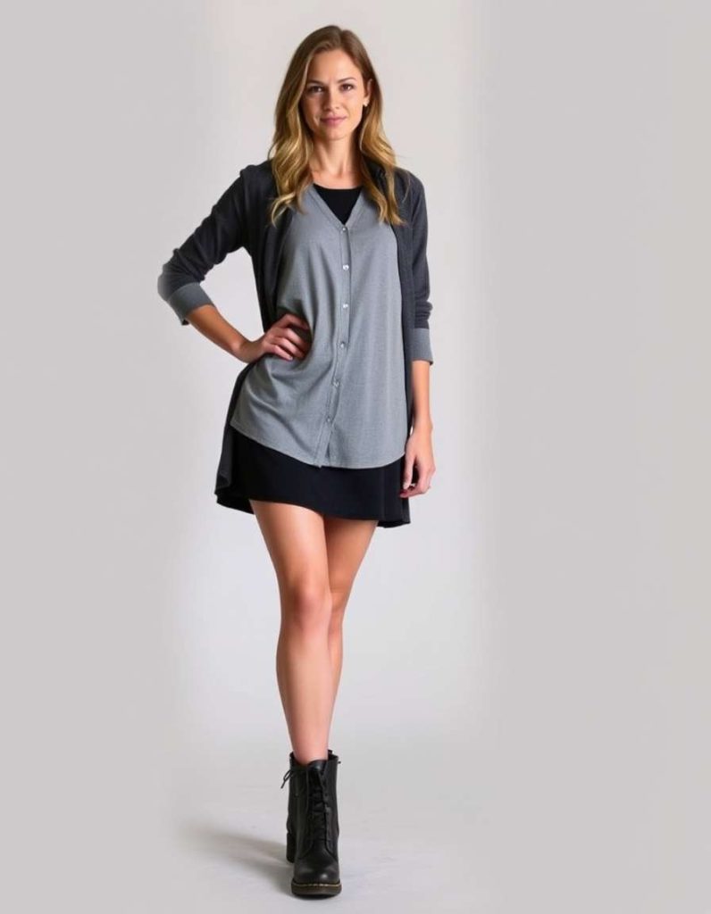 Layered dresses worn alongside chunky combat boots create a grunge ensemble that cleverly melds edge with femininity. This outfit is perfect for individuals wanting to inject a bit of attitude while ensuring comfort. The soft, neutral background accentuates the outfit’s unique and rebellious essence.