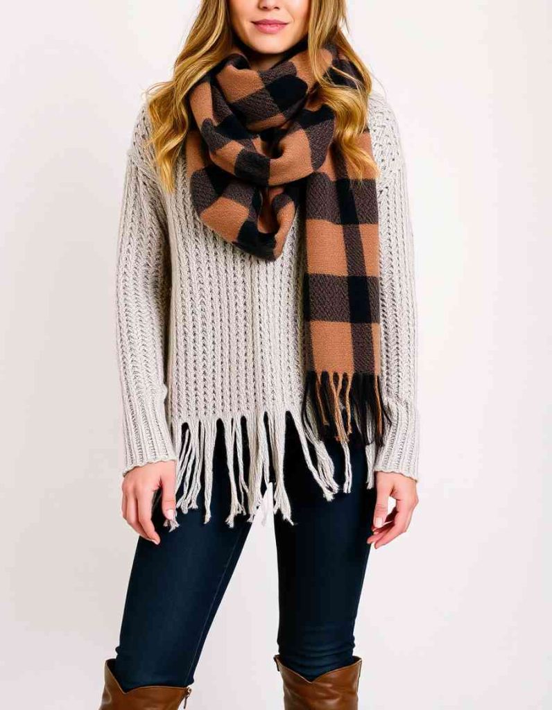 A ripped knit sweater teamed with a checkered scarf forms a grunge outfit that balances coziness with boldness. Adding dark jeans and boots enhances the look, contributing to its rebellious essence. The neutral backdrop permits the outfit’s grunge edge to shine.