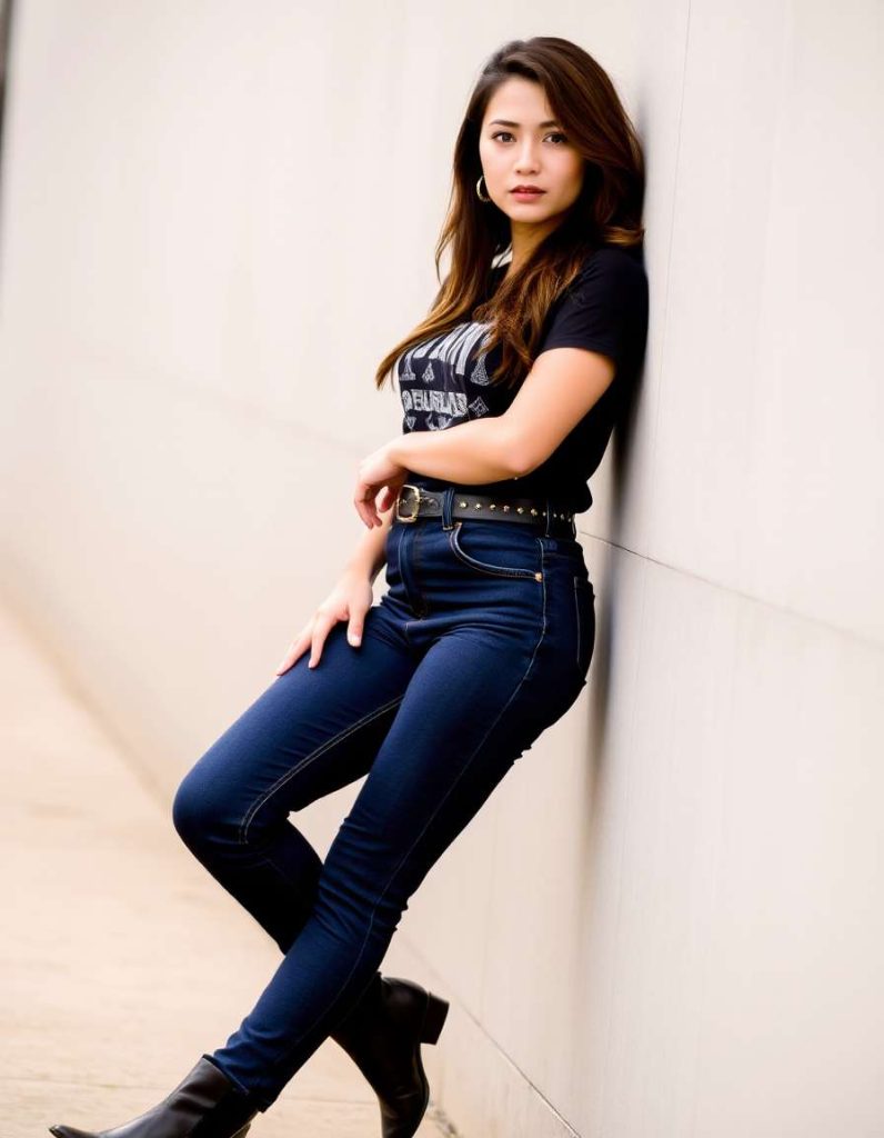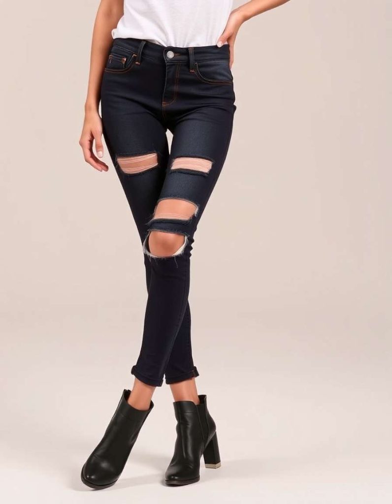A traditional grunge outfit, ripped skinny jeans matched with black ankle boots present an ideal blend of style and rebellion. Whether you’re hanging out or out and about, this getup ensures all eyes are on you. The soft, neutral background amplifies the outfit’s appeal even further.