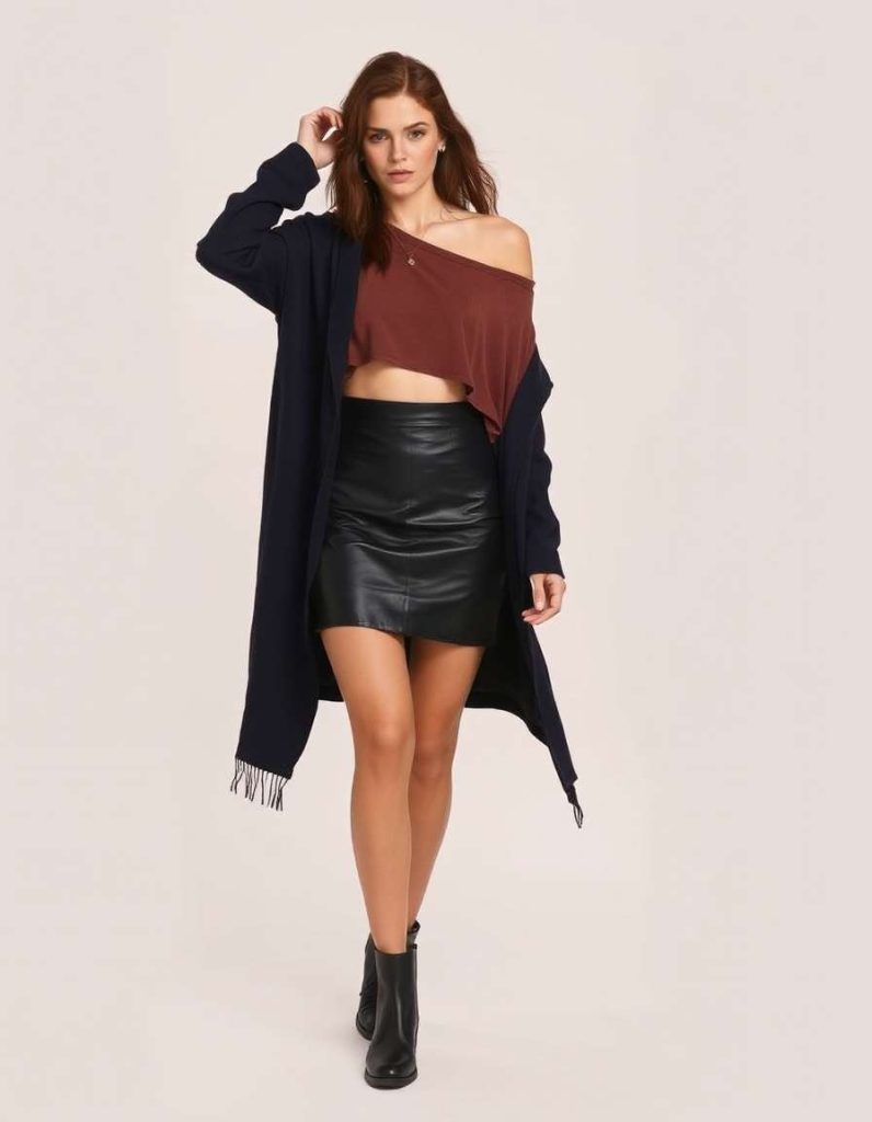 A black leather skirt teamed with a loose crop top and ankle boots forms a bold grunge ensemble. The striking blend of fabrics and silhouettes makes this appearance pop, ideal for individuals aiming to assert a strong presence. The gentle backdrop permits the outfit’s intense allure to take center stage.
