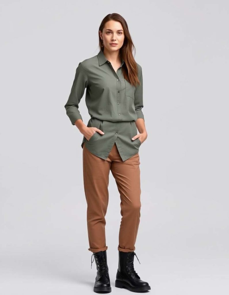 A button-down shirt tucked into pants and combined with Dr. Martens boots creates an elegant yet edgy grunge outfit. This mix of formal and informal components imparts a classic charm to the look. The soft background ensures the outfit’s strong demeanor takes the spotlight.
