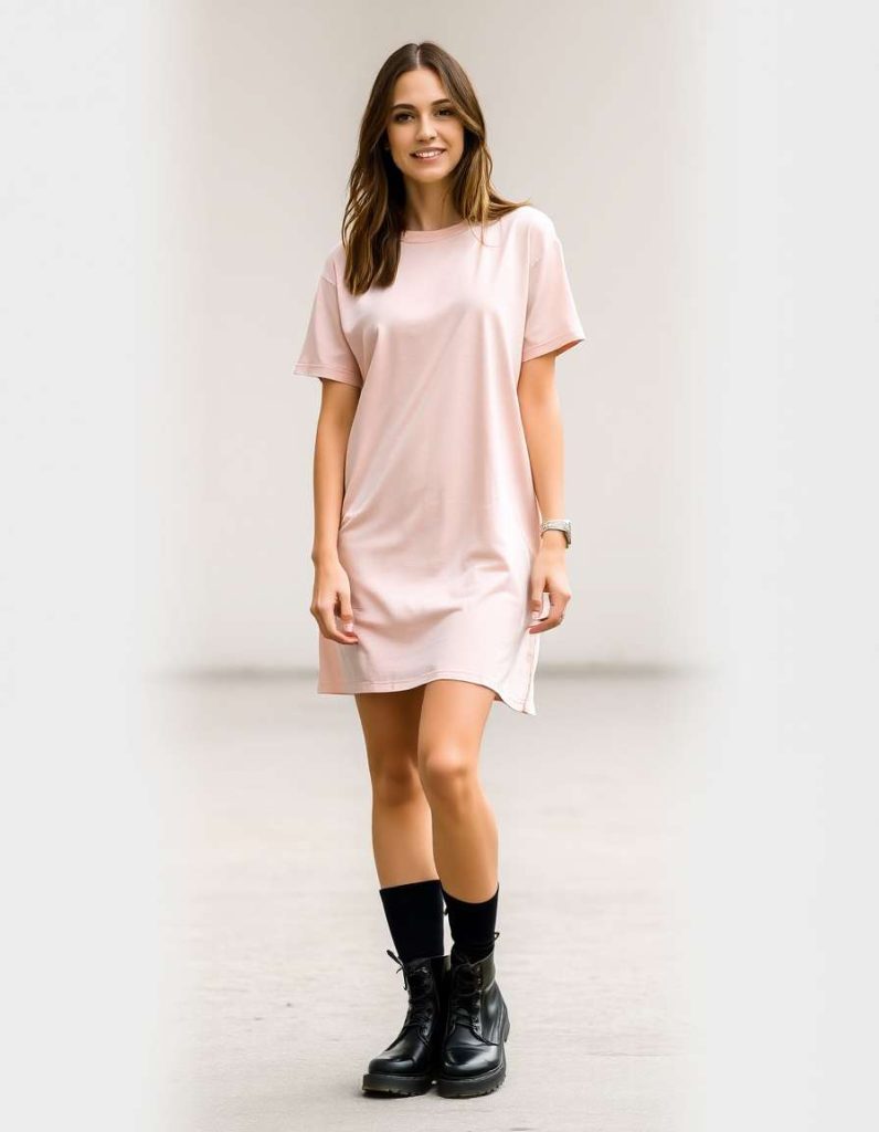 A t-shirt dress matched with Doc Martens boots results in a casual yet striking grunge outfit. This appearance is ideal for those who wish to display effortless style while remaining at ease. The neutral backdrop directs focus to the audacity of the ensemble.