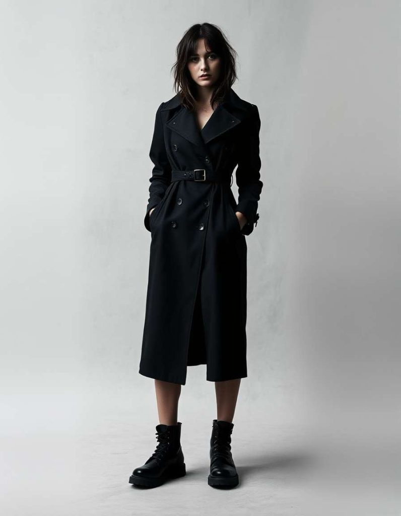 A lengthy trench coat teamed with chunky shoes makes for a striking and edgy grunge outfit. The oversized nature of the coat combined with the boldness of the footwear creates a commanding appearance. The soft backdrop keeps the outfit’s intense vibe in the limelight.