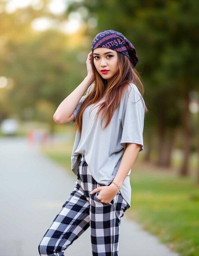 Plaid trousers matched with a bandana headband create a playful and carefree grunge ensemble. The relaxed t-shirt and sneakers round off the appearance, making it ideal for individuals who want to remain fashionable while feeling easygoing. The neutral backdrop emphasizes the grunge atmosphere of the outfit.