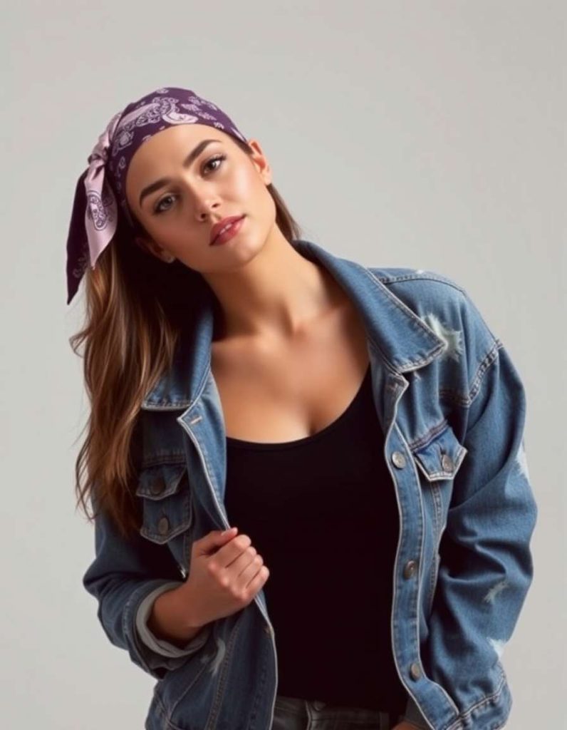 A distressed denim jacket coupled with a bandana forms a classic grunge outfit. The laid-back yet bold appearance is perfect for those wanting to inject some edge into their wardrobe. Its effortlessly cool vibe is ideal for everyday wear while exuding a hint of rebellion.