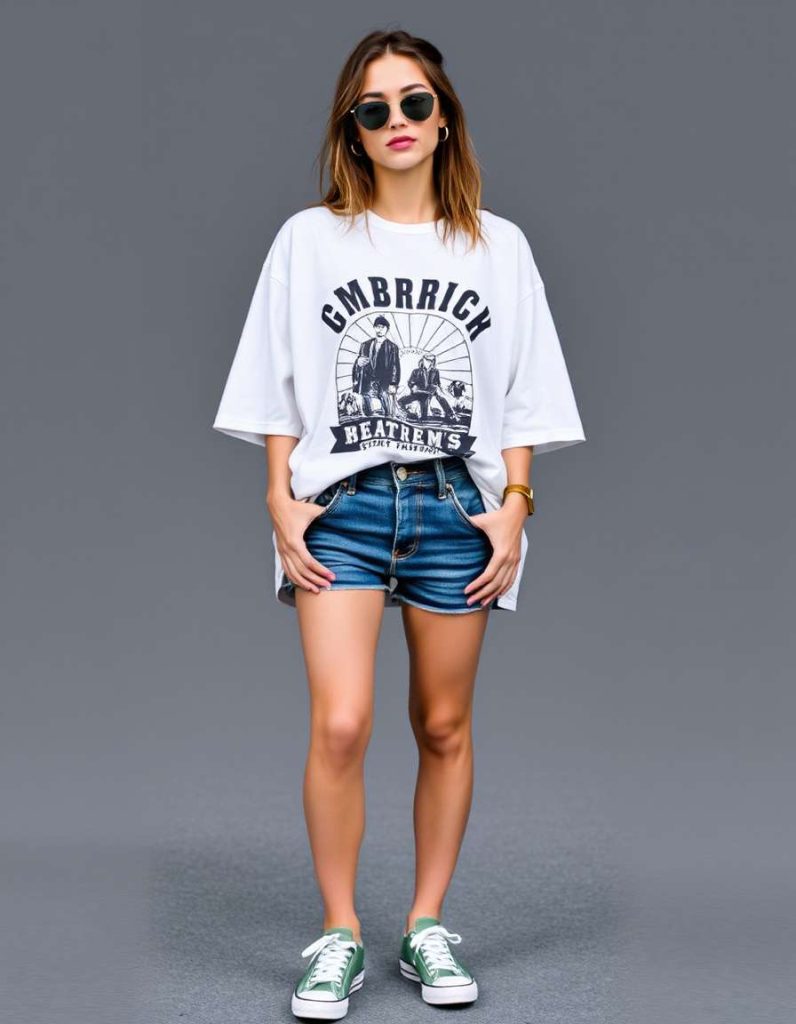 A graphic t-shirt tucked into high-waisted denim shorts creates a fun and easy-going grunge outfit. Pair it with laid-back sneakers, and you’re set for a chilled day filled with comfort and style. The neutral backdrop centers the outfit’s focus, enhancing its effortless appeal.