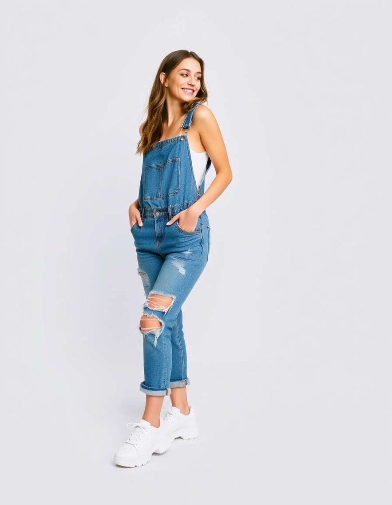 Distressed denim overalls paired with chunky white sneakers create a playful and casual grunge outfit. This mix achieves the perfect harmony between comfort and style, making it an ideal choice for anyone looking to make a subtle yet impactful statement. The soft backdrop ensures the outfit remains the focal point.