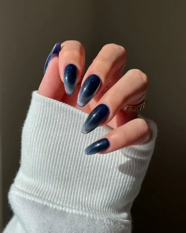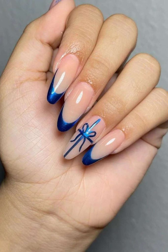 Stiletto French tips adorned with a sparkling blue chrome gradient offer a contemporary and refined twist on the traditional French manicure. The transition from light to dark metallic blue enhances the stiletto shape. This manicure is optimal for those seeking a glamorous and high-fashion aesthetic.