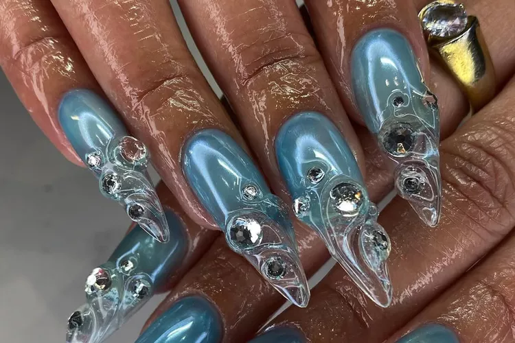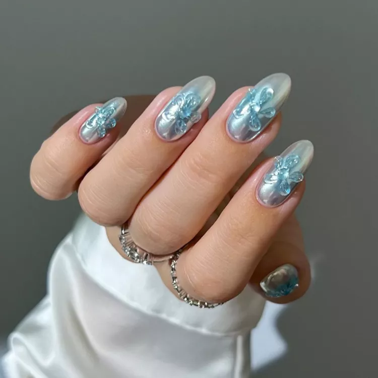 Water droplets blue chrome nails emulate the appearance of sparkling water beads upon a reflective surface. The 3D elements bring a lifelike quality, making the nails look vibrant and lively. This inventive manicure is perfect for those who adore nature-inspired nail artistry.