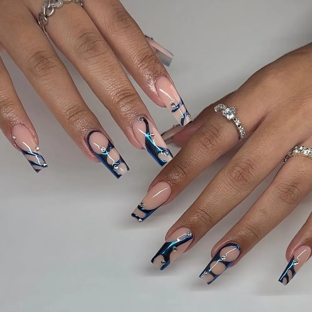Abstract design blue chrome nails showcase striking patterns and unconventional forms, imparting a bold artistic flair. The metallic blue chrome finish accentuates the intricate designs, resulting in a cutting-edge aesthetic. This style is ideal for those who enjoy innovative and fashionable nail art.