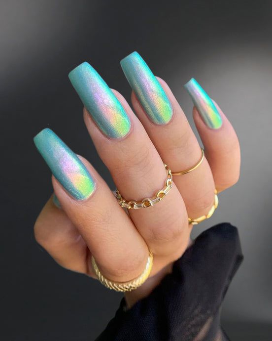 Square aqua chrome nails present a structured and fashionable shape with a vivid ocean-blue metallic sheen. The high-gloss effect amplifies the fresh and revitalizing aqua tone. This manicureis ideal for daily use, getaways, or significant events.