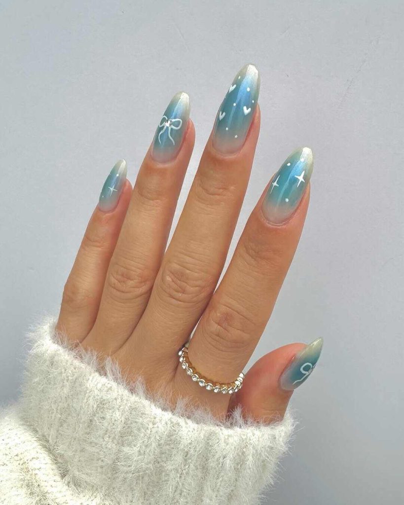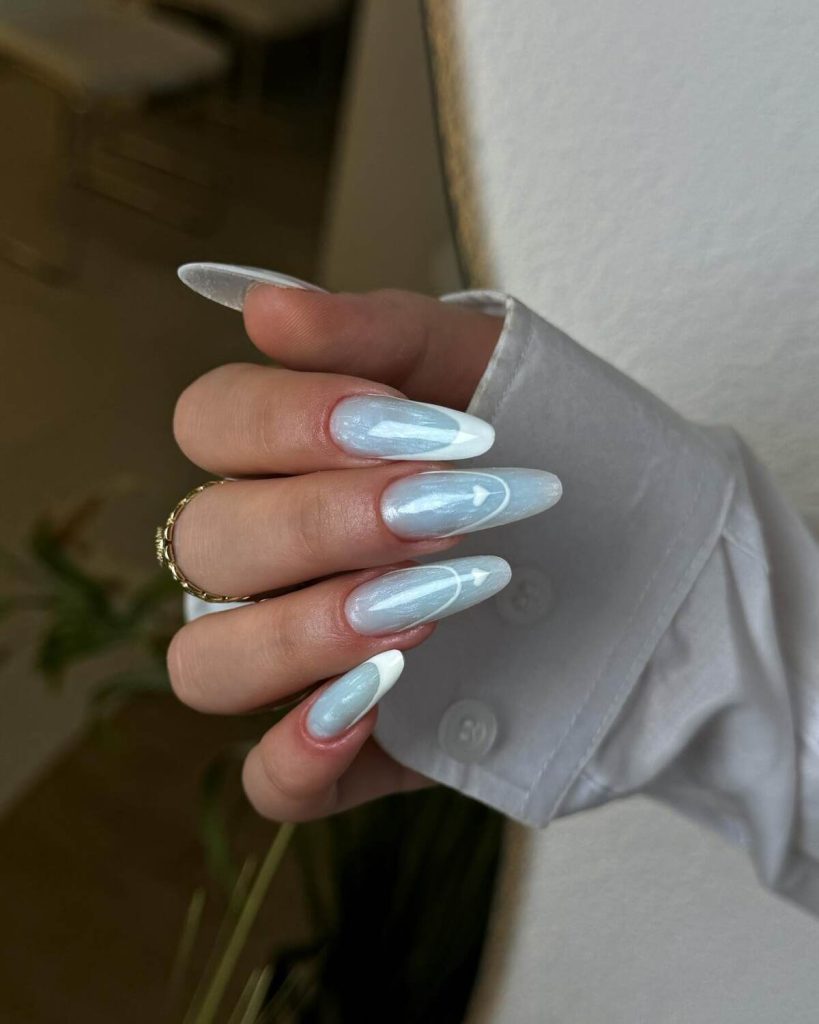 Extended almond-shaped white and blue nails provide a sleek and sophisticated look. The gradient from white to metallic blue delivers a contemporary and icy effect. This manicure is ideal for individuals who appreciate an elongated and chic nail form.