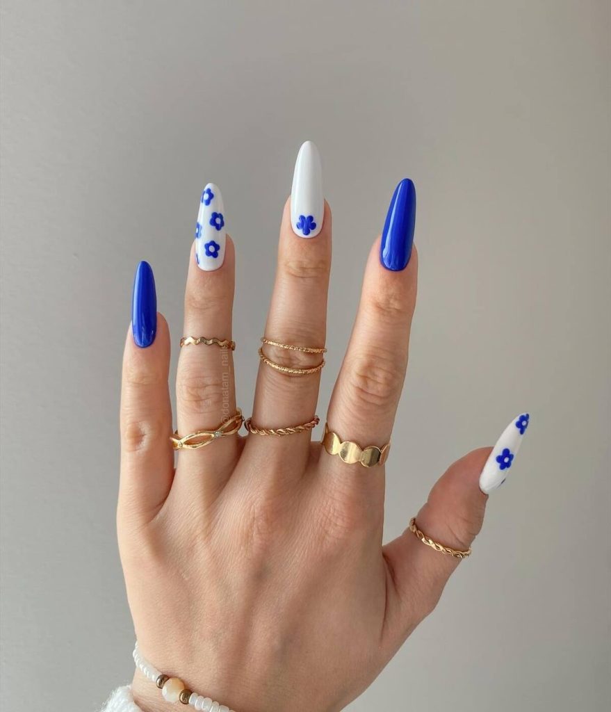 Blue and white floral almond blue chrome nails fuse delicate floral patterns with a shiny metallic background. The almond silhouette accentuates the sophistication of the design, giving the nails an elegant appearance. This manicure is suited for those who adore artistic and nature-inspired nail aesthetics.