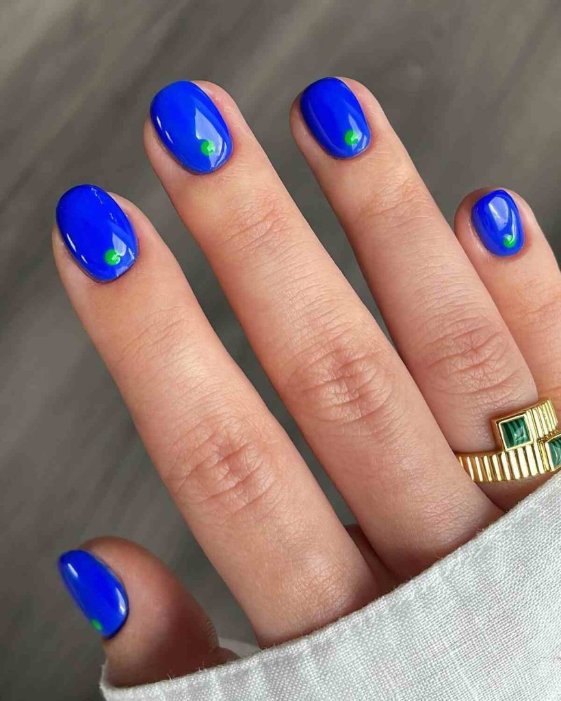 Short round blue chrome nails featuring a bright accent create a simple yet striking effect. The rounded shape keeps the nails looking natural and graceful, while the vibrant detail adds a cheerful burst of color. This style is ideal for those who favor a simplistic yet stylish manicure.