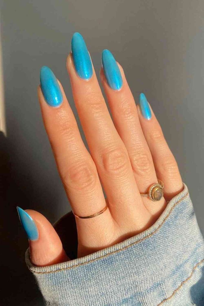 Ocean blue chrome nails boasting a reflective coat encapsulate the essence of ocean waves in a sleek and luminous manicure. The rich blue color paired with the high-gloss finish creates an effortlessly stunning appearance. Ideal for summertime or beach-themed styles, this design serves as a refreshing option.