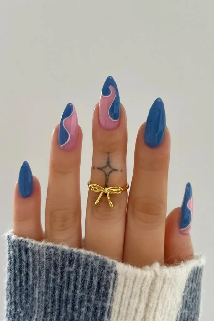 25. Glossy Stiletto Nails with Swirling Blue and Pink Design