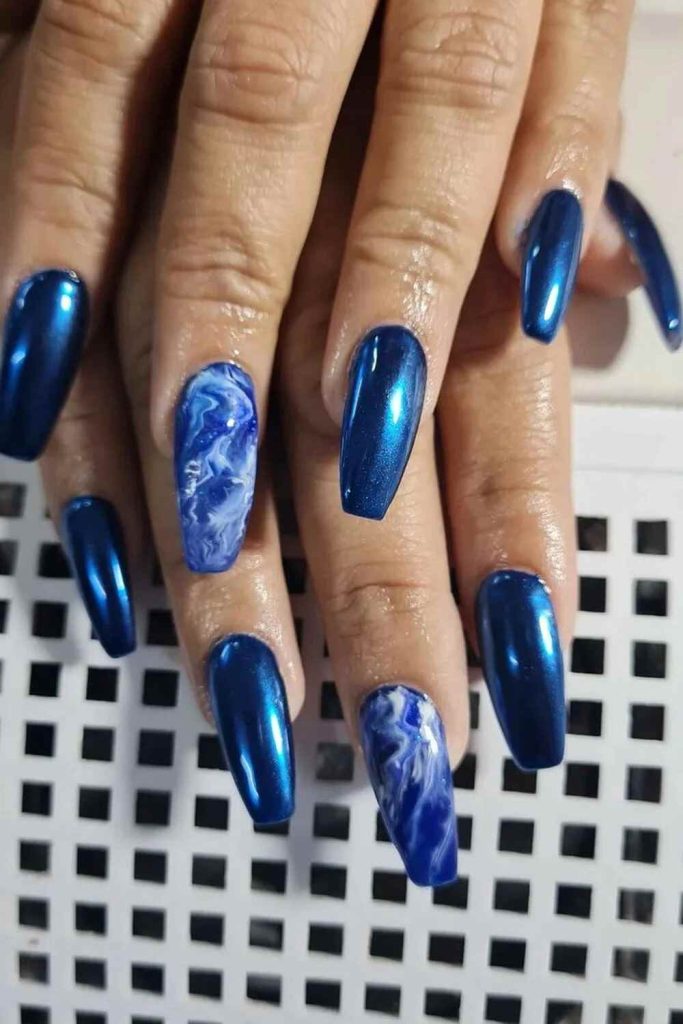 Glossy sapphire blue chrome nails featuring a marble accent create a luxurious and sophisticated look. The deep sapphire tone paired with subtle marble elements provides an opulent touch. This manicure is perfect for individuals who love a chic yet striking nail design.