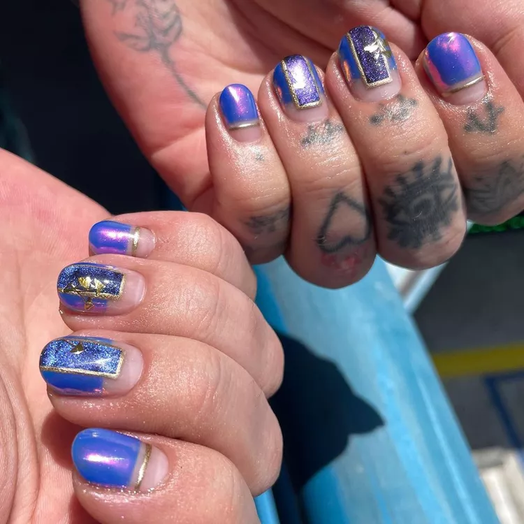 Gold and blue chrome nails merge two luxurious shades, crafting an extravagant manicure with a futuristic twist. The reflective gold accents beautifully contrast with the rich blue chrome, making the nails pop. This look is ideal for those who appreciate a design that is both elegant and striking.