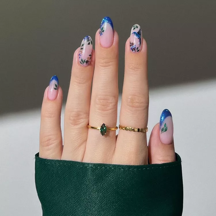 Garden-themed blue chrome nails fuse floral designs with a radiant metallic base, introducing a fresh and artistic vibe to the manicure. The detailed botanical motifs contrast beautifully with the gleaming blue chrome finish. This nature-inspired creation is perfect for a distinctive and refined nail look.