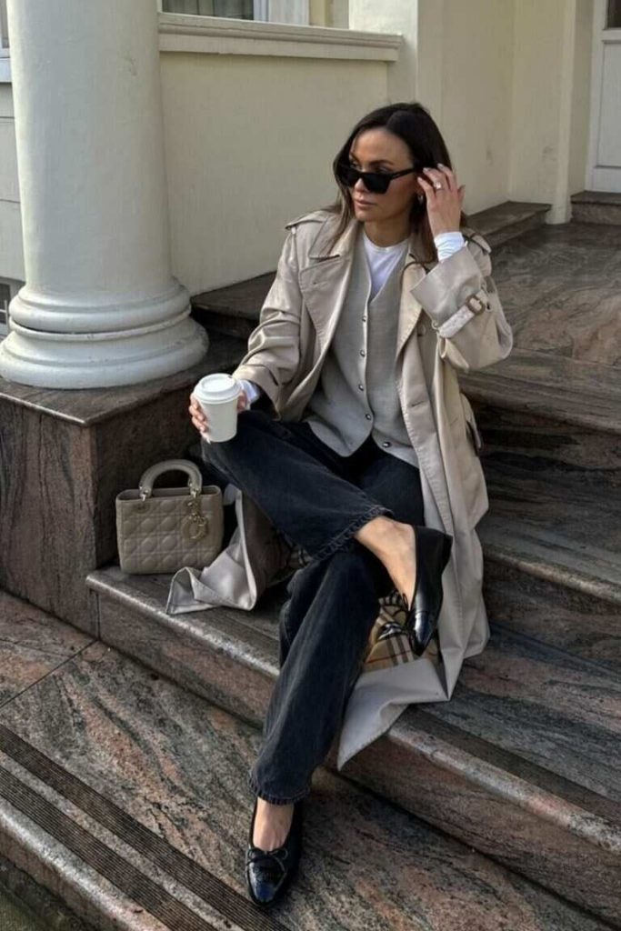 This Burberry Outfit Idea merges a Burberry coat with fitted jeans and loafers, providing a polished yet easygoing appearance. The coat offers a structured aspect to the outfit, while the jeans and loafers maintain a relaxed feel, making it ideal for errands or weekend outings.