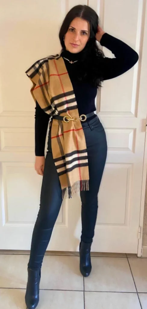 This cozy Burberry Outfit Idea pairs a Burberry plaid poncho with black skinny jeans, ensuring both comfort and style. Ideal for transitional weather, this outfit keeps you warm while looking fashionable. Finish off with ankle boots or loafers.