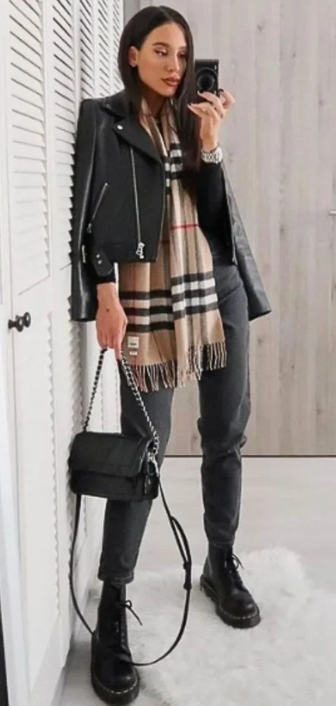 Add a touch of edge to your outfit with this Burberry Outfit Idea featuring a leather jacket styled with high-waisted pants. The fusion of luxury and daringness results in a sleek, contemporary look ideal for relaxed evenings out or weekend adventures. Incorporate statement accessories to enhance the outfit.