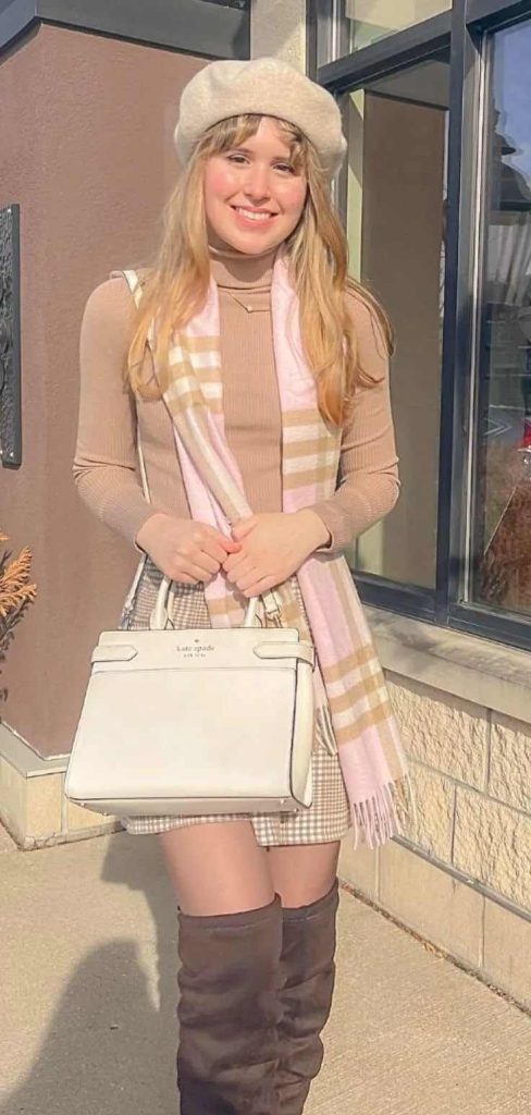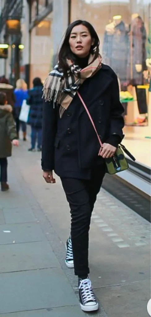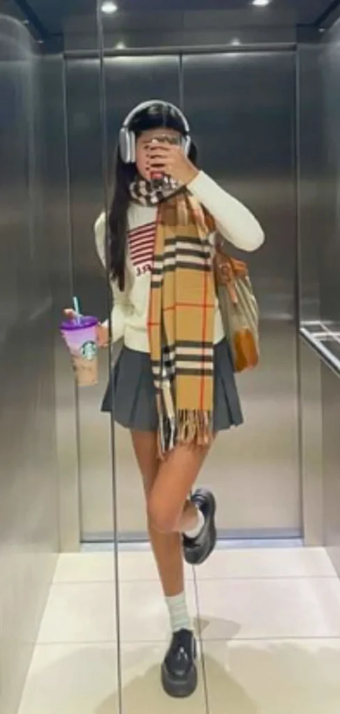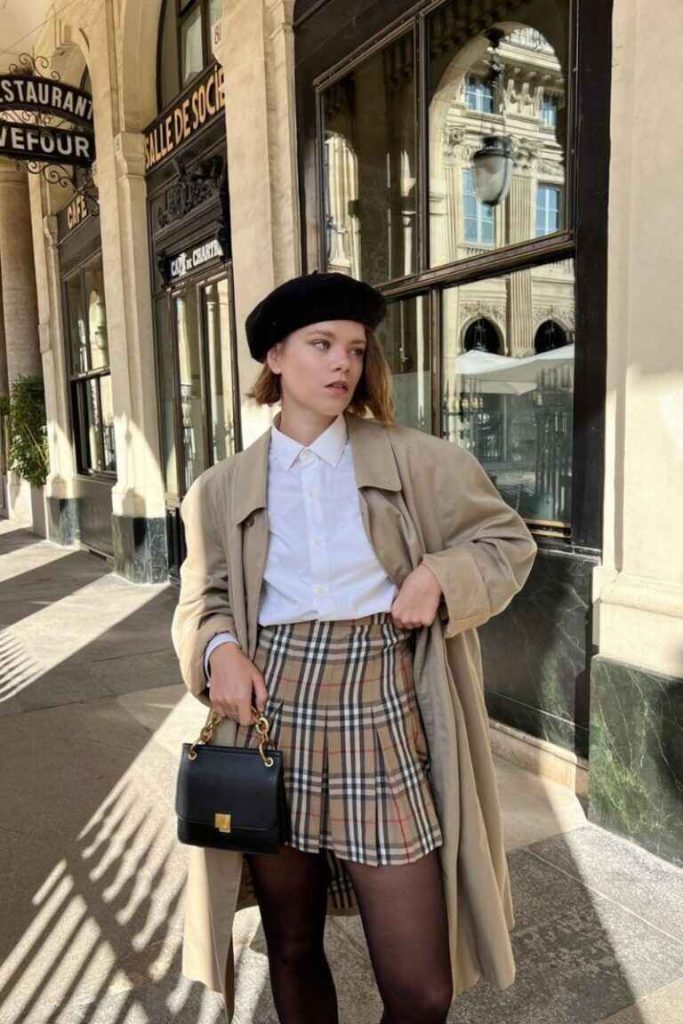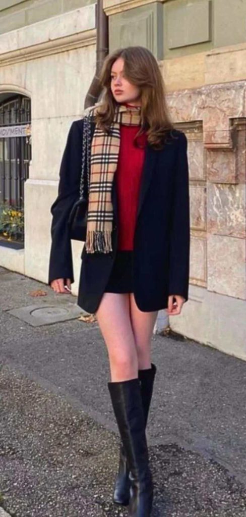 One of the coziest Burberry Outfit Ideas, this ensemble showcases a checkered skirt paired with a sleek black turtleneck. The blend of textures and designs creates a sophisticated preppy look, perfect for autumn or winter excursions. Add knee-high boots to finalize the elegant appearance.