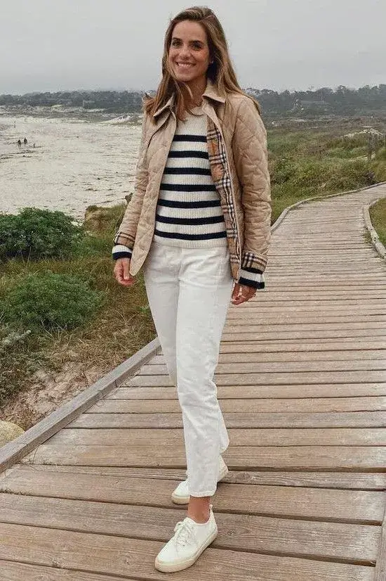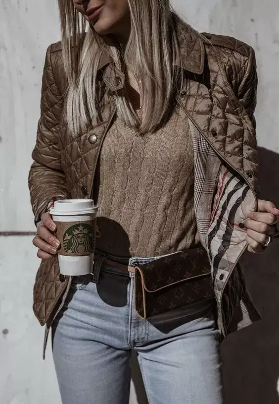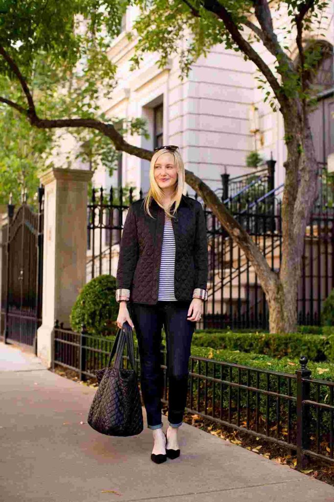 25. Burberry Quilted Jacket with Straight-Leg Jeans