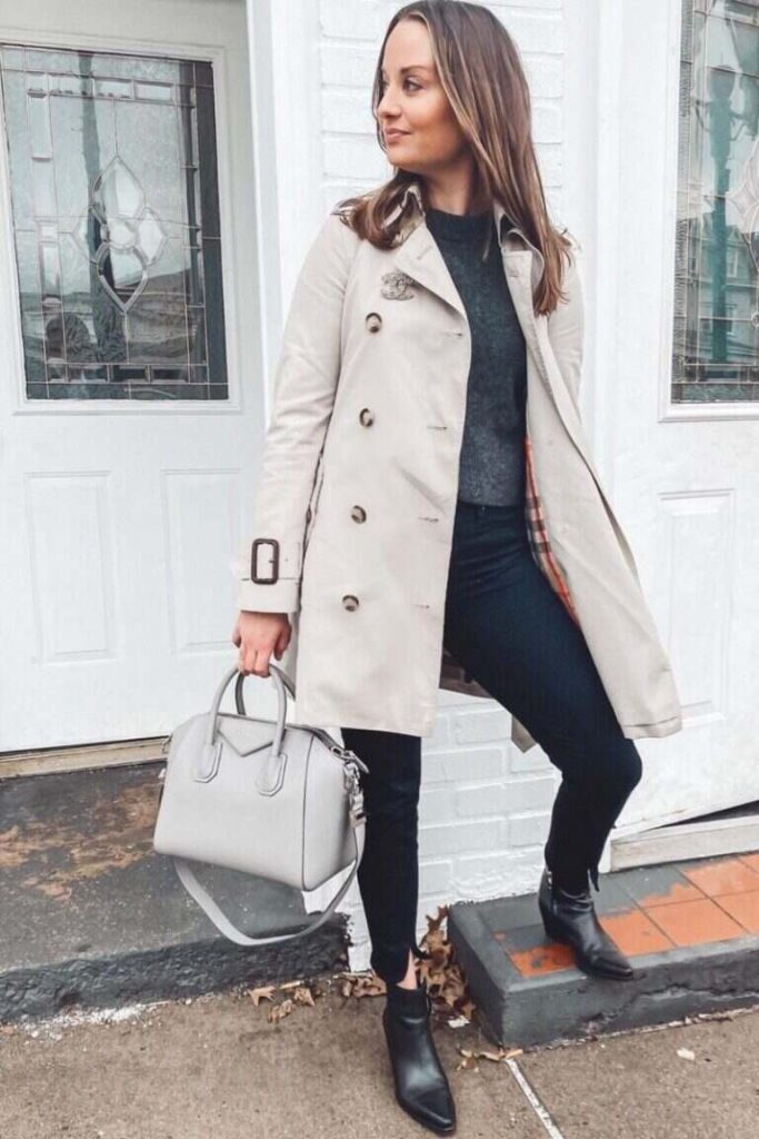 Elevate your fashion sense with one of the finest Burberry Outfit Ideas, showcasing a timeless trench coat coupled with dark skinny jeans. This appearance is ideal for an effortlessly chic aura, finished with black ankle boots for enhanced sophistication. Whether heading to the workplace or enjoying a relaxed day out, this outfit radiates classic Burberry appeal.