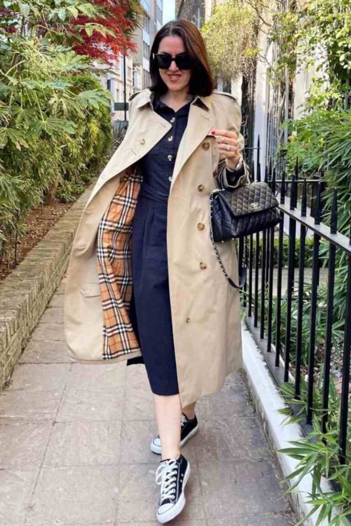 For a chic and feminine style, this Burberry Outfit Idea features a Burberry dress paired with block heels. Ideal for daytime occasions or casual gatherings, this combination conveys a fun yet sophisticated feeling. Keep accessories minimal to allow the outfit to take center stage.