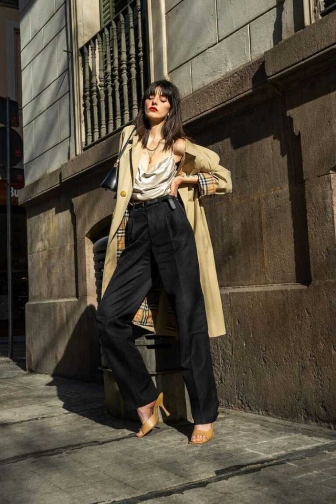 Select an eye-catching appearance with this Burberry Outfit Ideas, featuring a plaid cape matched with wide-leg trousers. The flowing form of the cape contrasts wonderfully with the tailored pants, rendering it a stylish selection for cooler weather. Finalize the outfit with heeled boots for additional sophistication.
