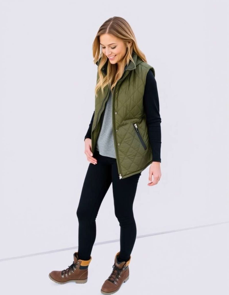 Snuggle into this vest ensemble for women featuring a quilted olive-green vest atop a thermal top, combined with dark leggings and robust hiking boots. This outdoor-inspired outfit is ideal for autumn excursions or laid-back outings. Whether you’re hitting the trails or doing errands, you’ll remain comfortable and stylish.