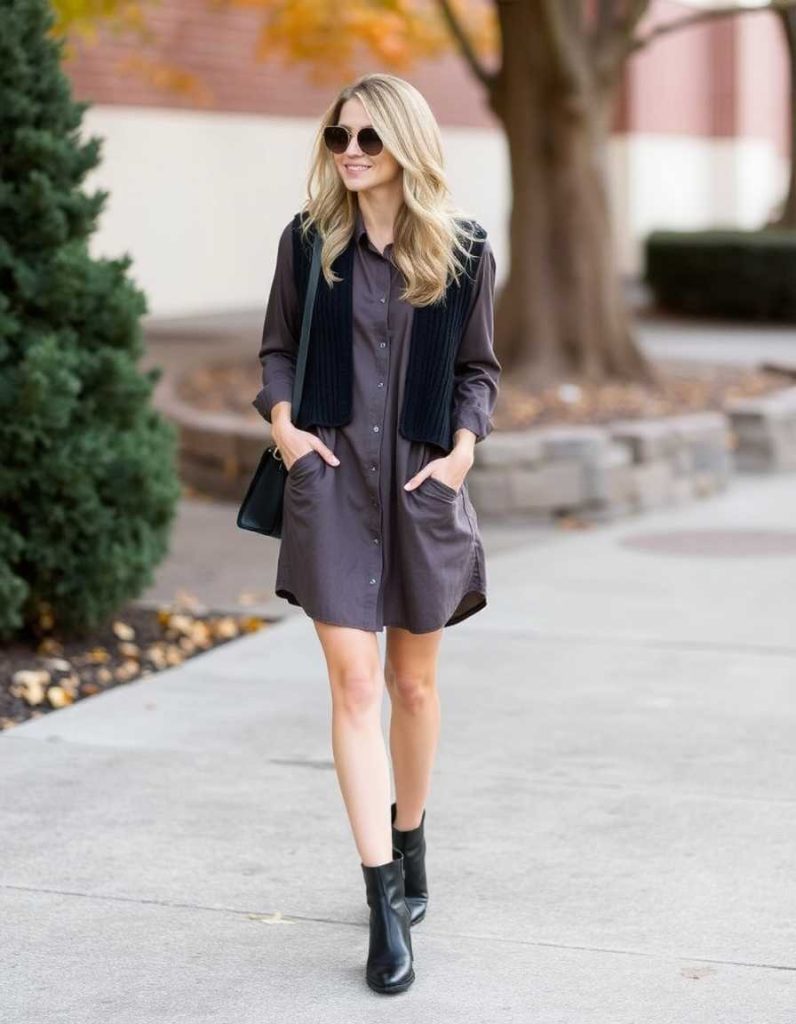 A contemporary take on layering, this vest ensembles for women combines a cropped sweater vest over an oversized shirt dress, finished with sleek ankle boots. The mix of textures and crisp lines creates a look that is perfect for chilly days while ensuring a fashionable and effortless feel.