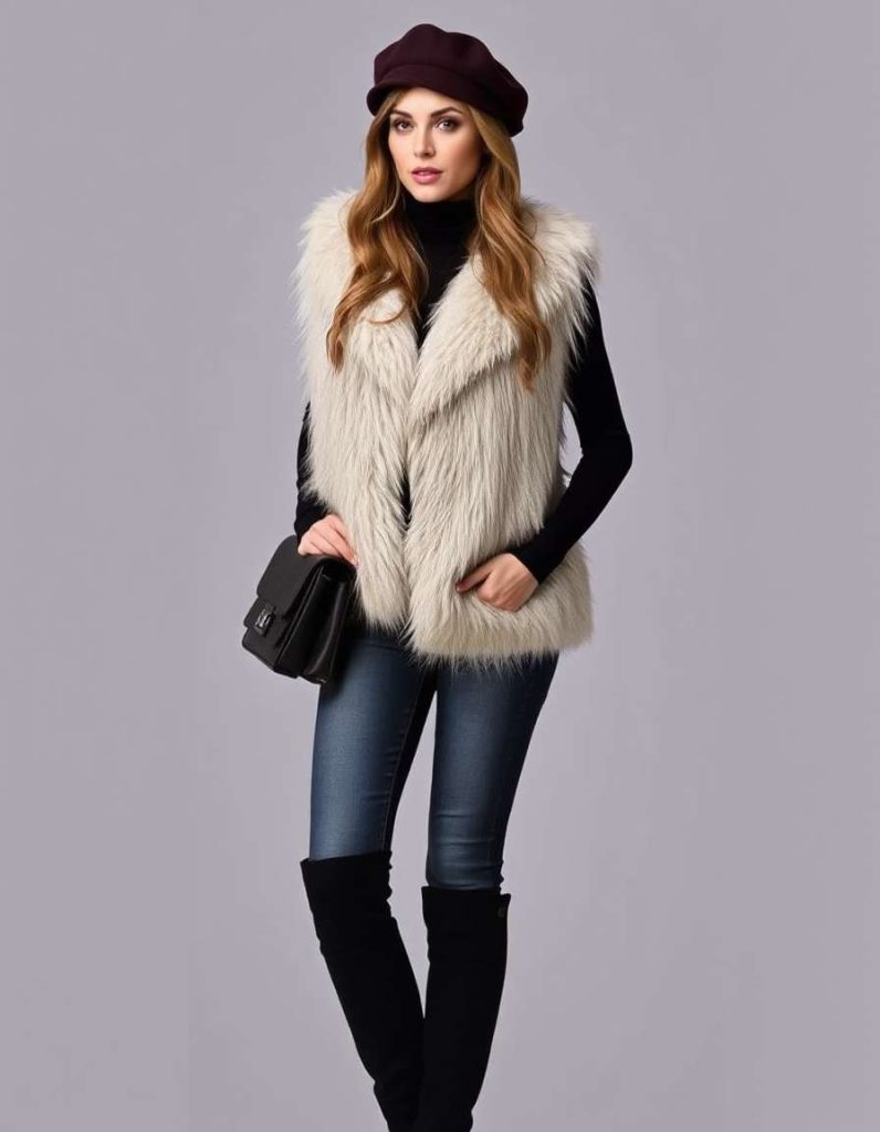 A shearling-lined vest combined with a denim mini skirt creates a splendid blend of warmth and style in this vest ensembles for women. Add knee-high boots and a snug sweater underneath for a stylish and functional autumn outfit. Ideal for a casual day out or weekend escapades.