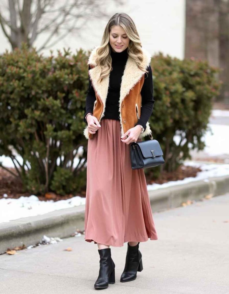 13. Chic Wool Vest with A-Line Skirt