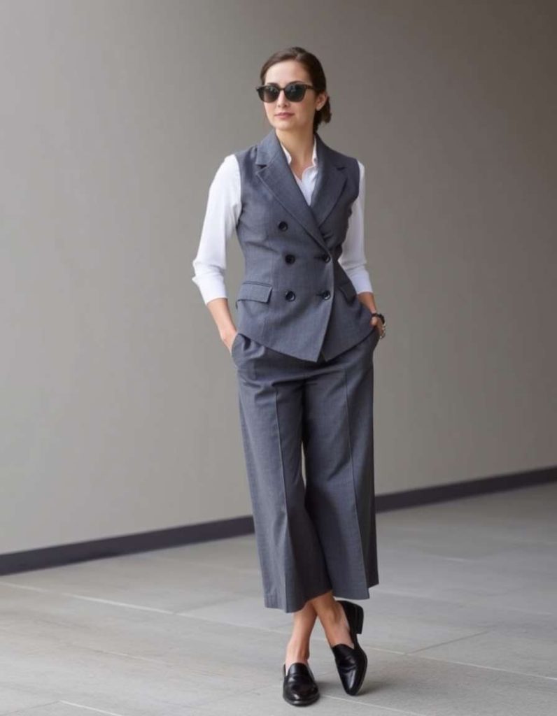 For a refined and elegant appearance, this vest ensemble for women combines a trench vest with wide-leg trousers and a form-fitting blouse. Suitable for professional environments or stylish dinners, the outfit provides a balanced silhouette. Complete the look with pointed-toe footwear for an extra touch of sophistication.
