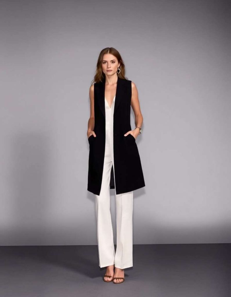 Enhance your professional attire with this elegant vest outfit for women, showcasing a classic black vest layered over a crisp white blouse. Paired with tailored trousers and refined black loafers, this sleek combination is ideal for making an impression in the office. Whether you’re attending a meeting or enjoying a lunch outing, this style blends sophistication with enduring fashion.