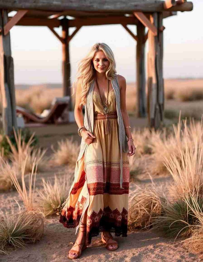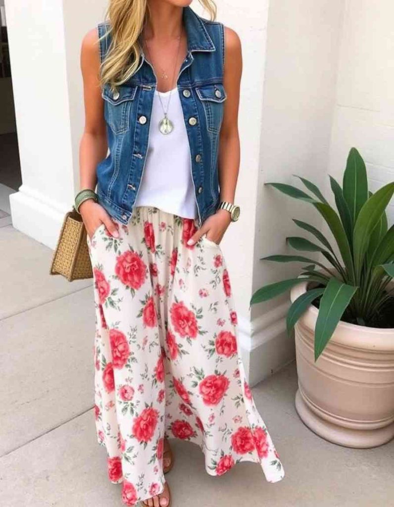 Embody a bohemian aesthetic with a vest outfit for women featuring a buttoned denim vest layered over a tank top, matched with a flowing floral maxi skirt. This look is great for a laid-back day out, whether you’re enjoying a festival or walking through the park. Add flat sandals or espadrilles for an effortless yet stylish appearance.