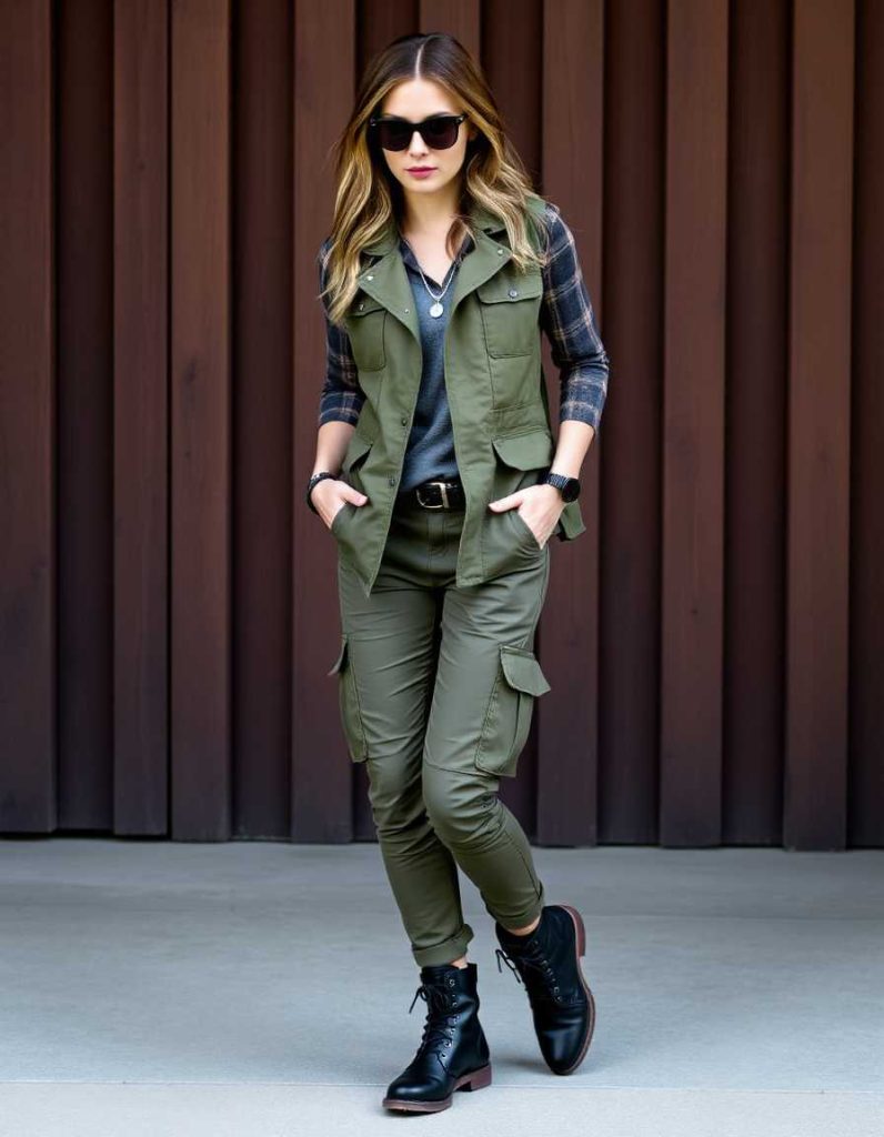 This striking and daring vest outfit for women showcases a military-inspired vest matched with skinny black trousers. The rugged appearance is perfect for a night out or a fashionable event. Complete the look with combat boots for a tough, trendy impression.