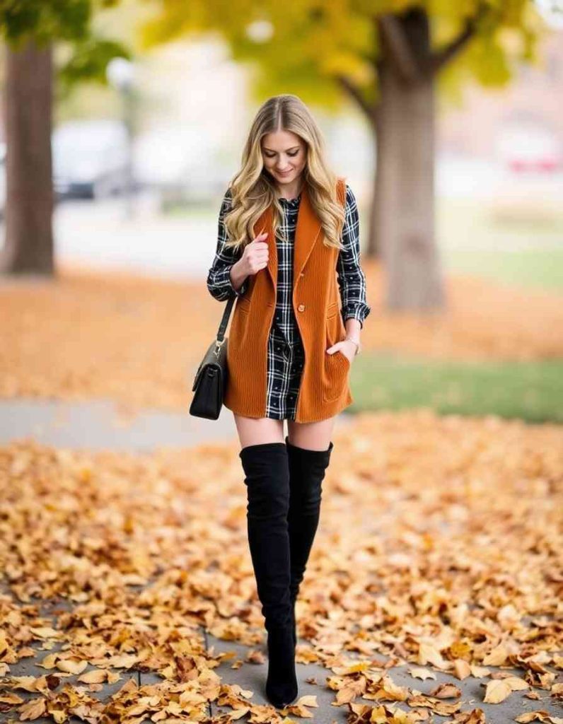This ideal autumn outfit, featuring a stylish wool vest matched with an A-line skirt and knee-high boots, is perfect for cooler days. Whether heading to the office or enjoying a weekend outing with friends, this cozy yet fashionable look is versatile. Layer with a turtleneck for additional warmth.