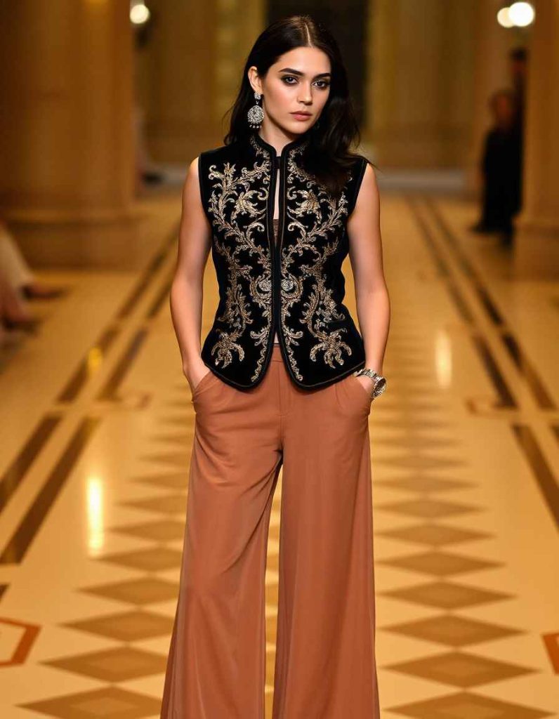 A striking and stylish vest ensembles for women, the double-breasted vest is paired with wide-legged palazzo pants for an elegant, flowing appearance. Suited for a night out or a refined daytime event, this combination merges classic tailoring with modern sophistication. Add heeled sandals to finalize the ensemble.