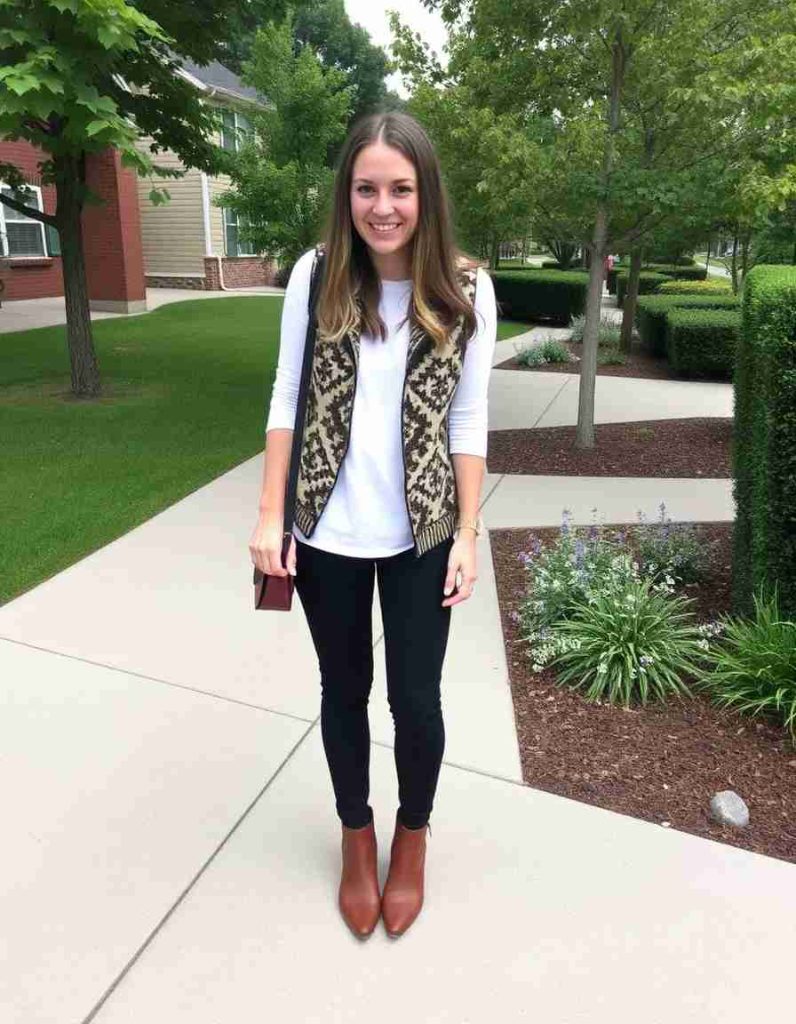 For a comfy yet fashionable appearance, opt for this vest outfit for women with an oversized knit vest teamed with wide-leg jeans. The neutral colors create a laid-back, stylish atmosphere that’s perfect for cooler days. Finish the ensemble with ankle boots or sneakers for an effortlessly chic outfit. Excellent for weekends or casual outings!