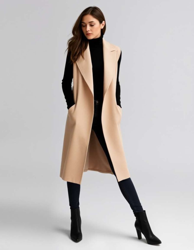 Make an impression with a longline vest paired with skinny jeans for a streamlined and refined vest outfit for women. This minimalist yet stylish appearance is suitable for both professional and casual outings. The sleek design and high-waisted jeans elongate your silhouette, adding an element of grace to your fashion.