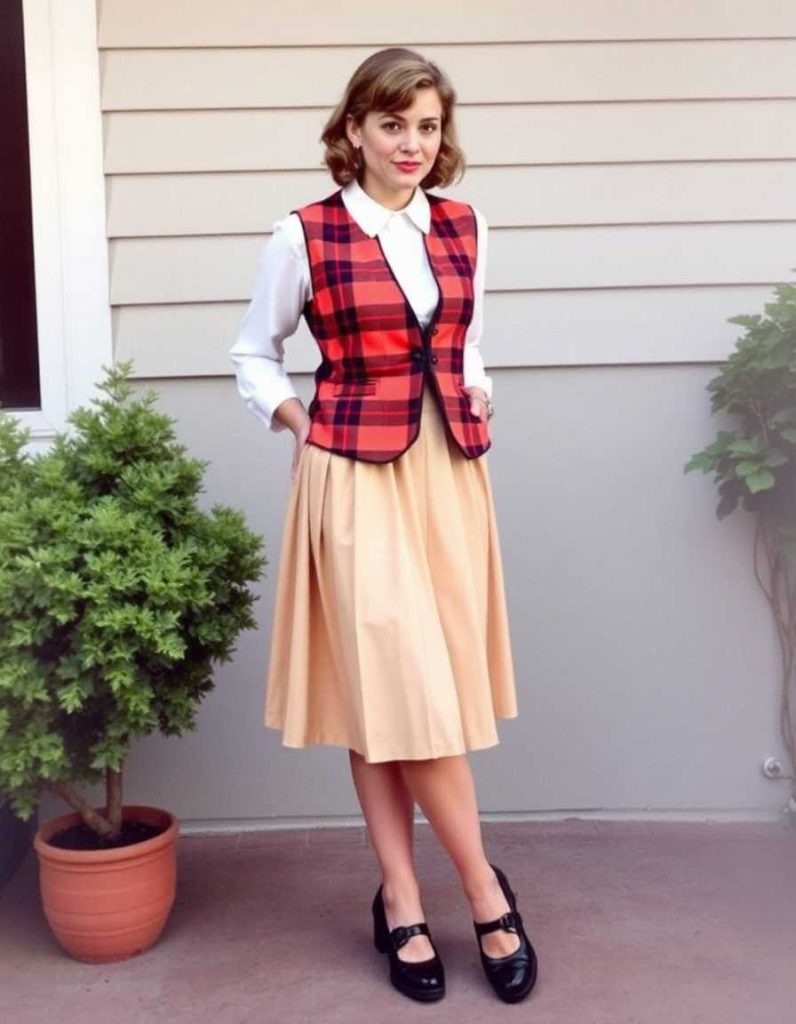 For a preppy, feminine appearance, this vest outfit for women combines a plaid vest with a pleated midi skirt. The union of classic patterns and flattering silhouettes creates a stylish, nostalgic aesthetic. Complete this vintage-inspired look with a pair of Mary Jane shoes or ballet flats, making it perfect for casual outings or lunch dates.
